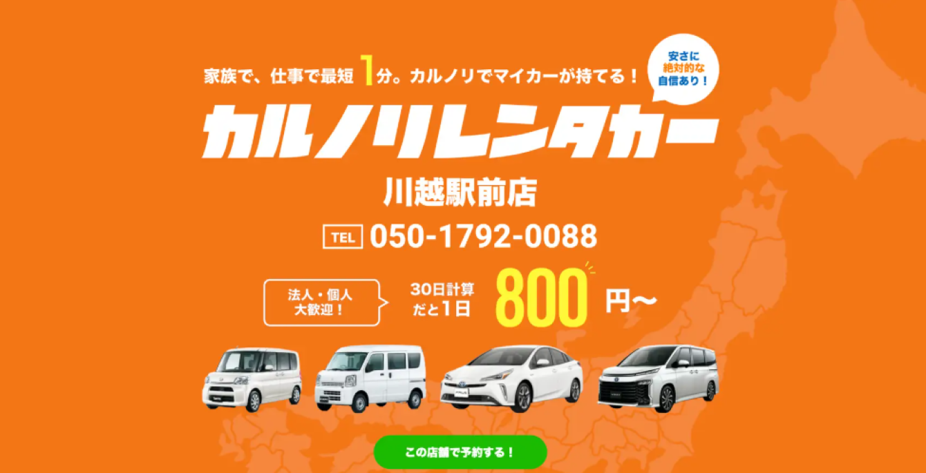 カルノリレンタカー株式会社は、埼玉県内5店舗目となる「カルノリレンタカー川越駅前店」を2026年4月16日にオープンした。同社はマンスリーおよびウィークリー利用に特化した格安レンタカー事業を展開しており、長期利用に対応した店舗網の拡大を進めている。