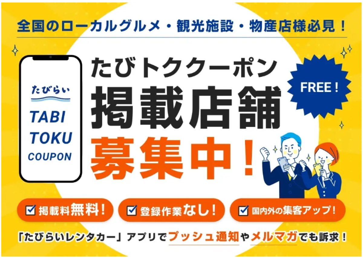 株式会社パムは、同社が提供する「たびらいレンタカーアプリ」において、旅行者向けクーポン配信サービス「たびトククーポン」の掲載店舗募集を開始した。掲載料無料かつ登録作業不要で参加できる仕組みを特徴としており、全国の飲食店や観光施設、物産店などに向けて旅行者の集客支援を行う取り組みである。