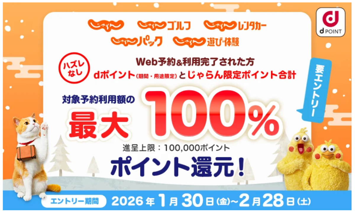 NTTドコモは、旅行予約サイトじゃらんnetにおいて、「最大全額ポイント還元キャンペーン」を2026年1月30日から2月28日まで実施する。本キャンペーンでは、宿泊予約に加えじゃらんレンタカーの利用も対象となり、レンタカーを含めた旅行手配を行うことで当選確率が大きく高まる点が特徴である。