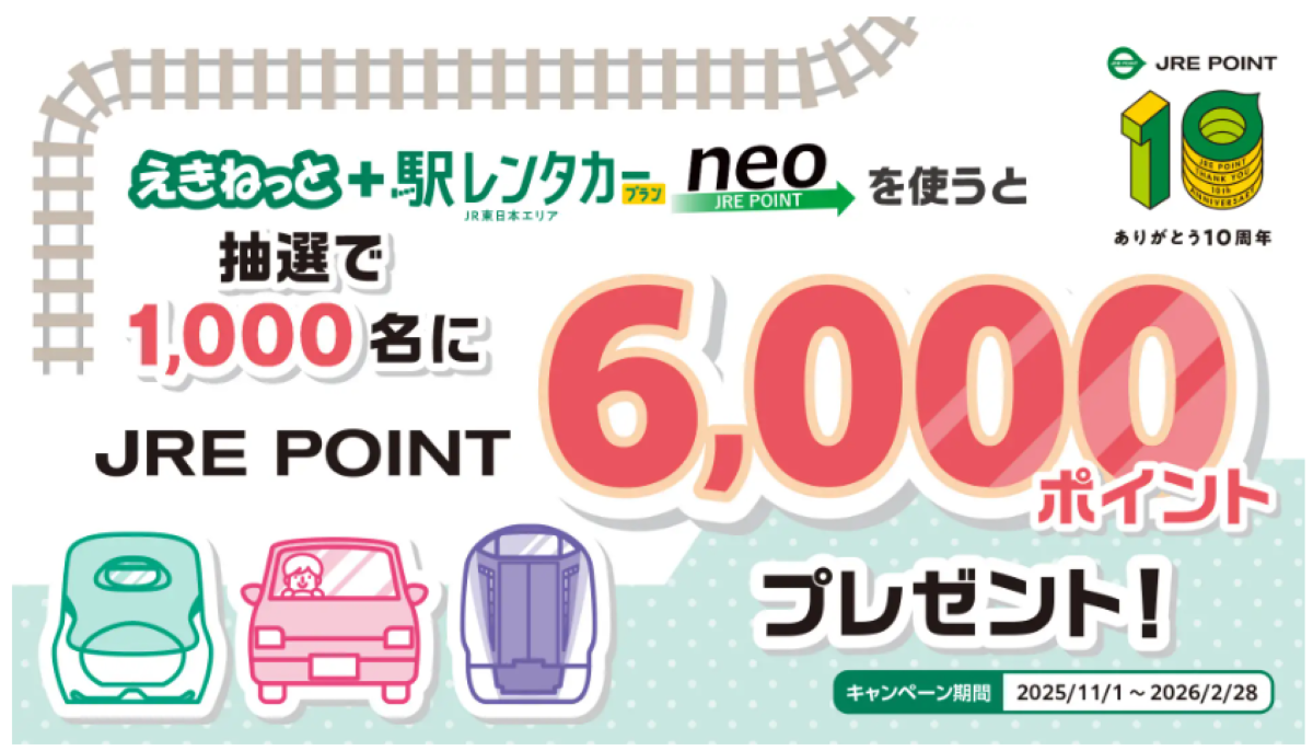JR東日本レンタリース株式会社は、JRE POINTの10周年を記念し、東日本エリアの駅レンタカーを対象とした「えきねっと+駅レンタカープラン neo」を利用すると抽選で最大6,000ポイントが当たるキャンペーンを2025年11月1日から2026年2月28日まで実施する。期間中は、JRE POINTの通常付与に加え、抽選で総勢1,000名に6,000ポイントを進呈するものである。