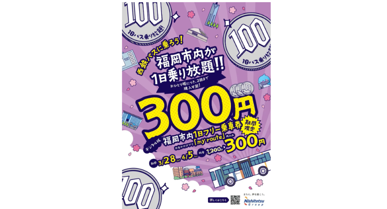 キャンペーンでは、「my route」アプリ内で利用できる「西鉄バス 福岡市内1日フリー乗車券」を通常価格1,200円のところ300円で販売する。対象はデジタル乗車券で、アプリ内から購入できる。各日とも始発から最終バスまで利用可能であり、通勤・通学や買い物、観光など福岡市内の移動を手軽に行うことができる。