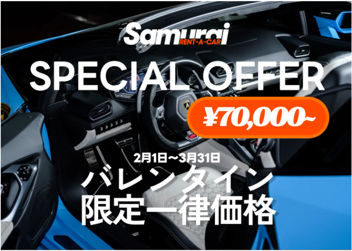 超高級車レンタルに特化する株式会社SAMURAIは、2026年2月1日から3月31日までの期間、「バレンタイン&ホワイトデー特別キャンペーン」を実施する。ロールスロイス、ランボルギーニ、マクラーレン、アストンマーティンという世界的ブランド4車種を、通常7万円~13万円超のところ、6時間プラン一律7万円で提供する内容であり、最大6万5,000円の割引となる。