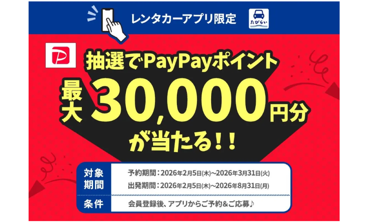 株式会社パムは、2026年2月5日から3月31日までの期間、同社が運営する「たびらいレンタカーアプリ」にて、PayPayポイントが当たる会員向けキャンペーンを実施する。期間中にアプリで会員登録のうえレンタカーを予約し、専用フォームから応募したユーザーを対象に、抽選で36名に最大3万円分のPayPayポイントを進呈する。