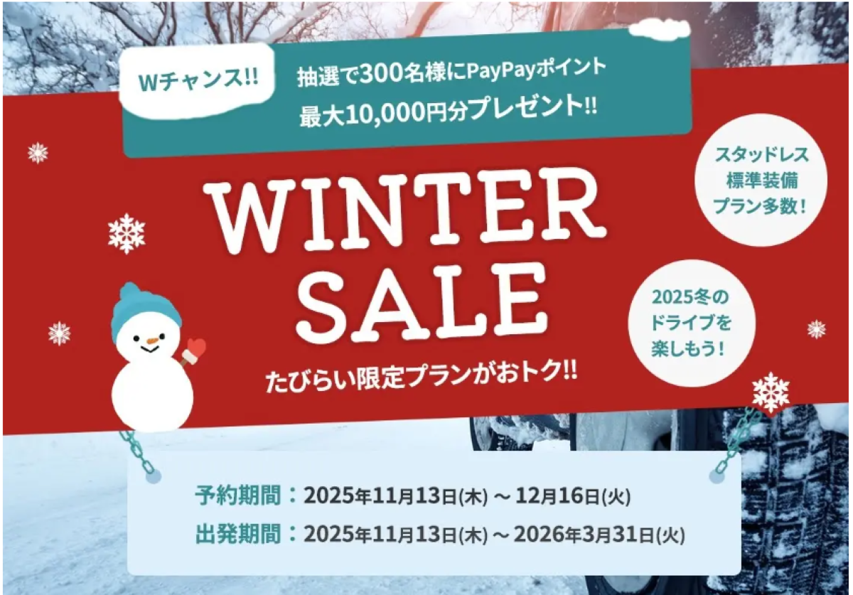 また、同期間中にはアプリ限定キャンペーンも同時開催される。たびらいレンタカーアプリから会員登録のうえ予約・応募した利用者を対象に、抽選で300名に最大1万円分のPayPayポイントを進呈するという。対象期間は2025年11月13日から2026年1月13日までで、「WINTER SALE」のプランも対象に含まれる。