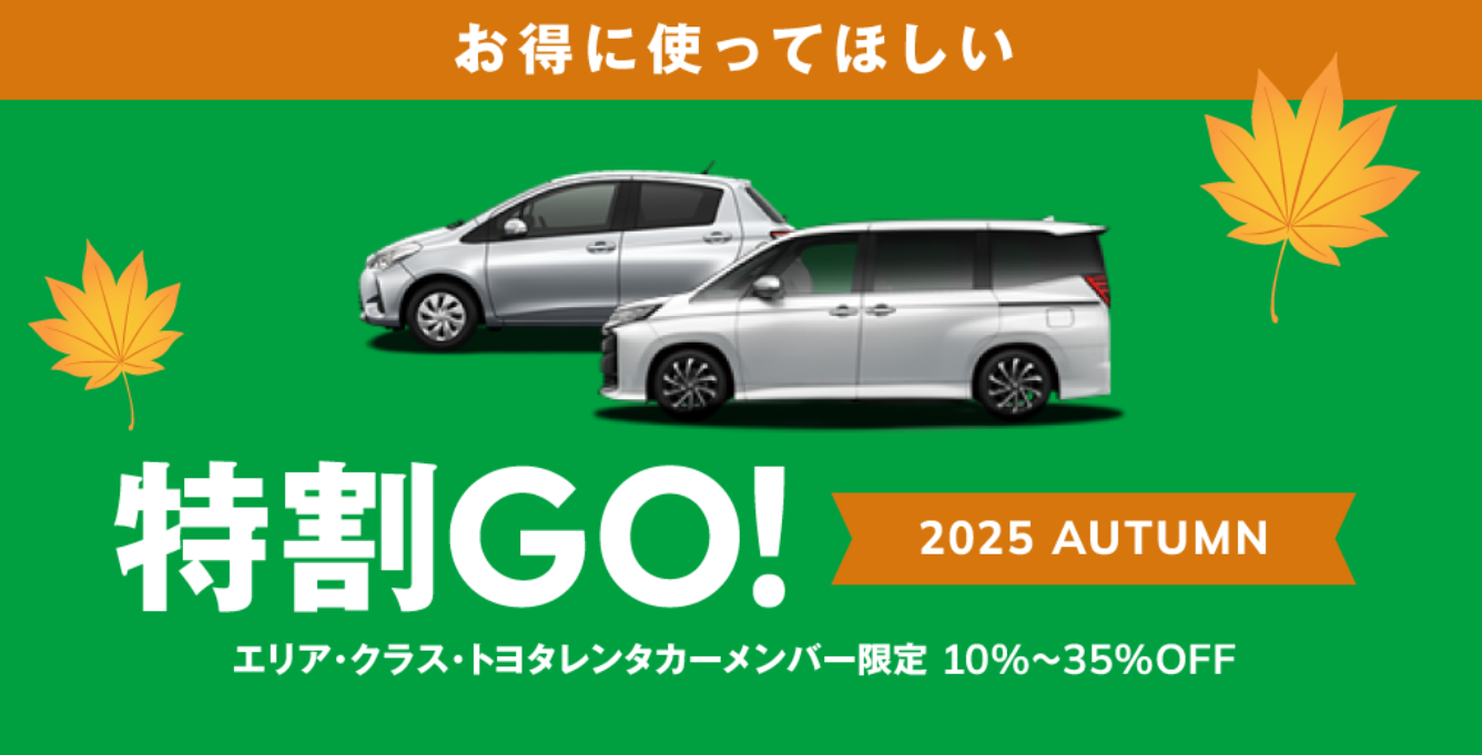トヨタレンタカーは、会員限定の秋季キャンペーン「特割GO! 2025 AUTUMN」を開始した。対象期間は2025年10月1日から2026年1月12日までで、出発・返却ともにこの期間内の利用が対象となる。予約対象期間は2025年8月18日から12月12日までで、期間中に国内Webサイトまたは公式アプリから予約を行い、対象エリアで出発した会員が割引を受けられる。