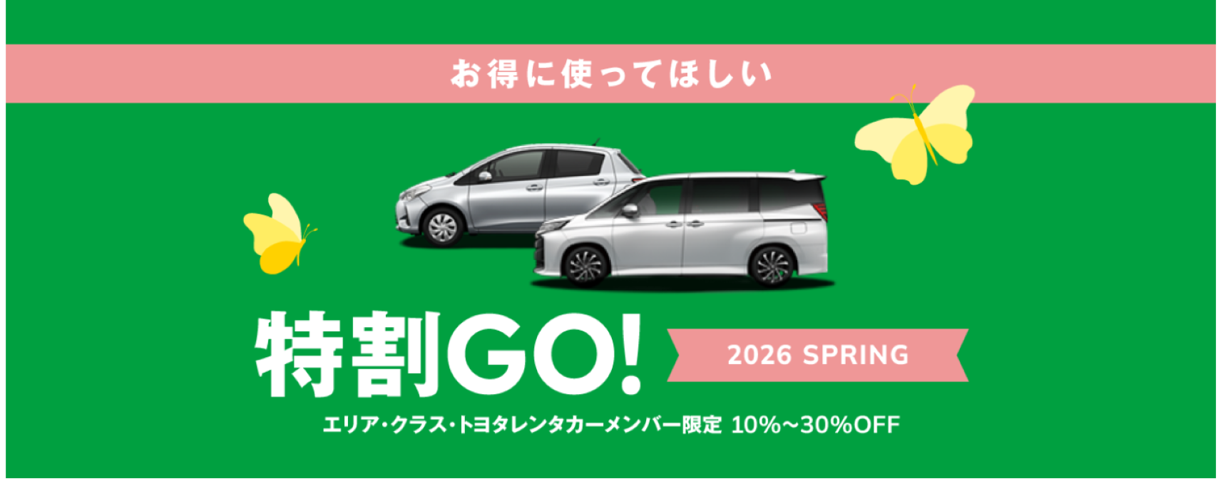 トヨタレンタカーは、会員向け割引キャンペーン「特割GO!」を展開している。対象となるのは、トヨタレンタカー国内Webサイトまたはアプリから、会員登録およびログインした状態で予約した利用者である。予約時期に応じて「早割」と「直前割」が用意されており、春の行楽や帰省、出張などに合わせて対象車両をお得に利用できる点が特徴だ。