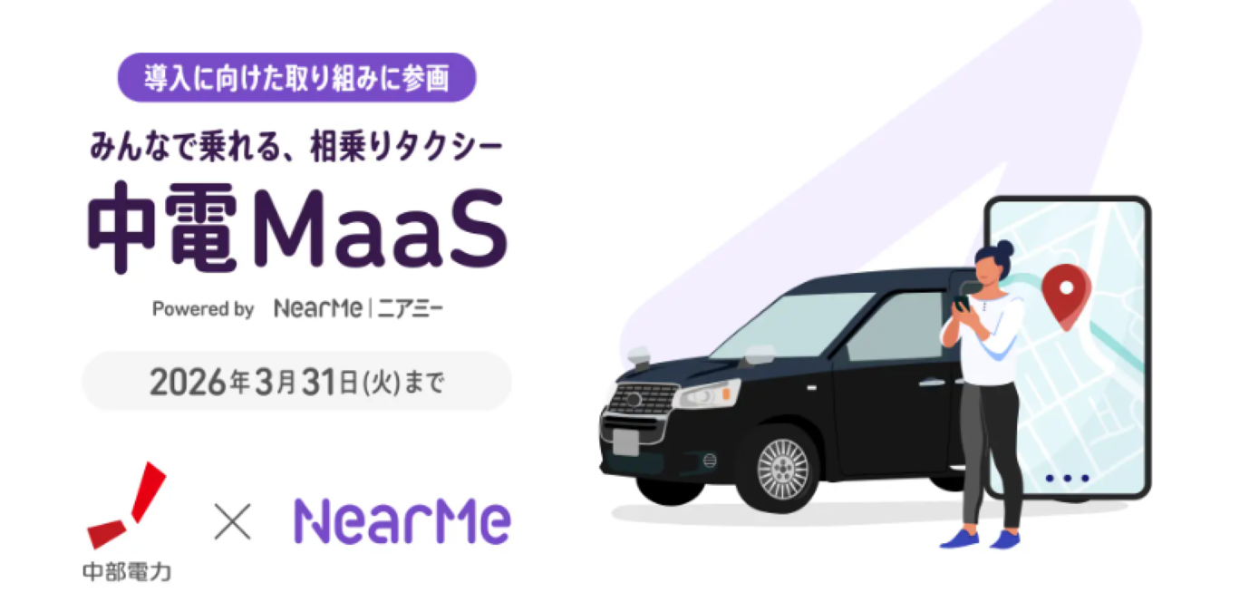 移動課題に取り組むソーシャルデザインカンパニー、株式会社NearMe(ニアミー)は、中部電力株式会社と連携し、名古屋市の一部地域においてオンデマンド乗り合いタクシー「中電MaaS Powered by NearMe」の導入に向けた取り組みに参画する。運行期間は2025年11月17日から2026年3月31日までである。