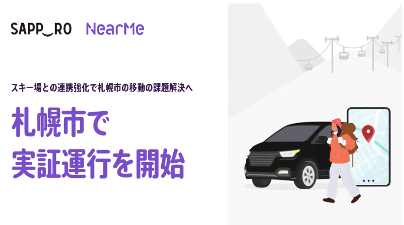 こうした状況を受け、AIを活用したタクシーのシェアサービス「NearMe(ニアミー)」は、札幌市と連携し、市内スキー場へのアクセス改善を目的とした実証運行を2026年1月16日から開始する。複数の利用者が同一方向へ向かう際に1台のタクシーをシェアする仕組みを活用し、交通供給の効率化と利用者の利便性向上を図る。