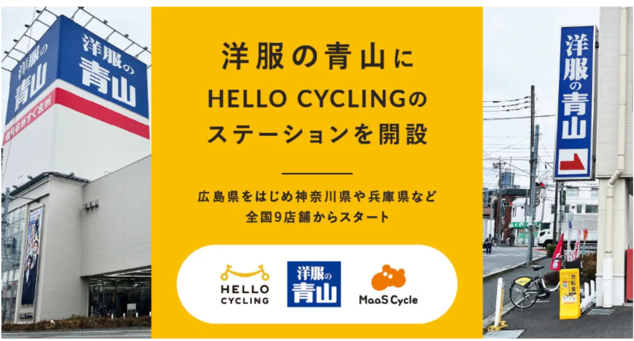 OpenStreet株式会社モビリティプラットフォーム株式会社は、青山商事が展開する「洋服の青山」店舗にシェアサイクルサービス「HELLO CYCLING」のステーションを設置した。2026年2月には広島県内の2店舗を含む全国9店舗で展開が開始され、今後は全国の店舗への拡大を見据えている。