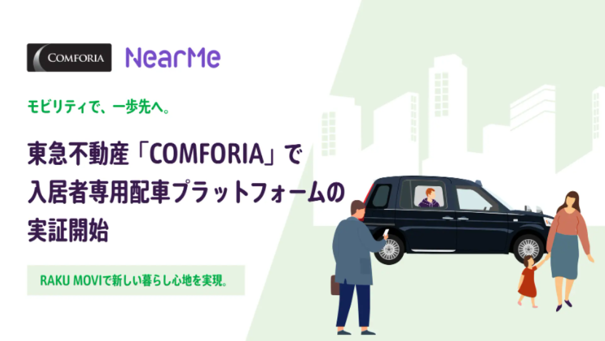 移動課題の解決に取り組むソーシャルデザインカンパニーの株式会社NearMeは、東急不動産株式会社と連携し、賃貸レジデンス「COMFORIA(コンフォリア)」シリーズにおいて、居住者専用の配車プラットフォームサービス「RAKU MOVI by COMFORIA」の実証実験を2025年10月より開始した。
